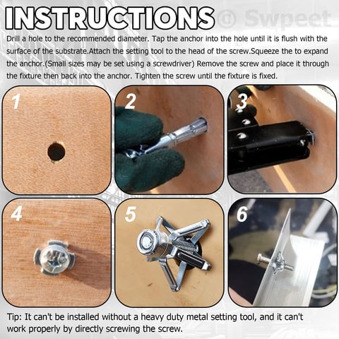 ✅ Easy To Use - 1. Drill a hole to the recommended diameter. 2. Tap the anchor into the hole until it is flush with the surface of the substrate. 3. Attach the setting tool to the head of the screw.Squeeze the to expand the anchor.(Small sizes may be set using a screwdriver) 4. Remove the screw and place it through the fixture then back into the anchor. Tighten the screw until the fixture is fixed.